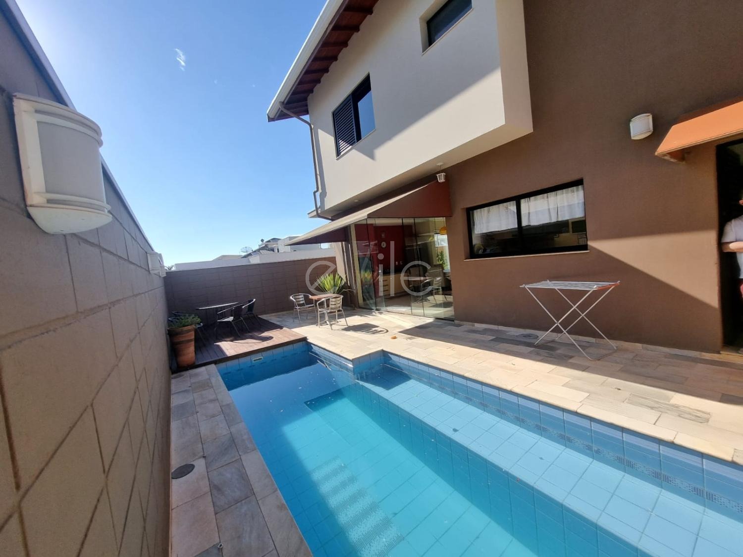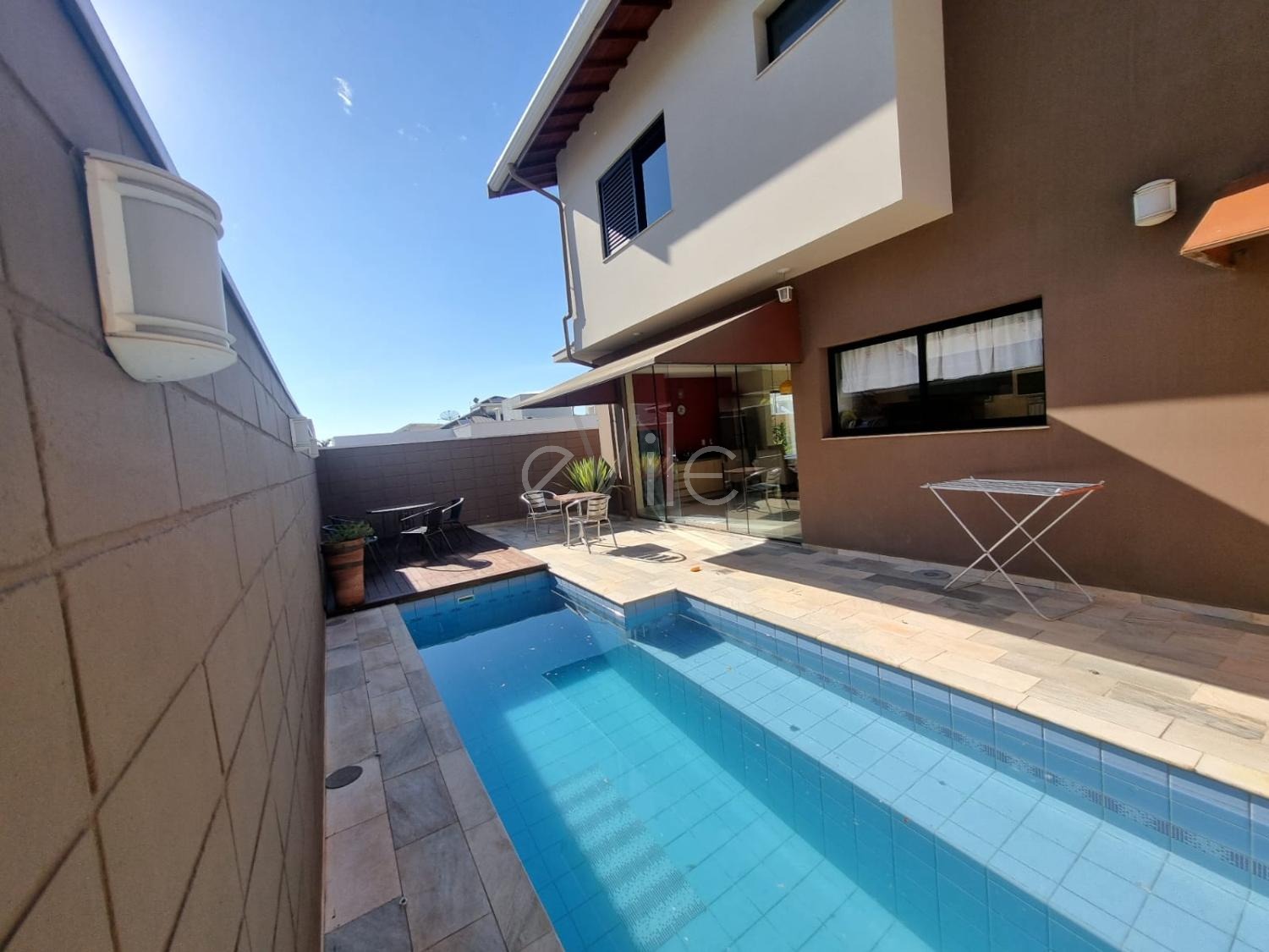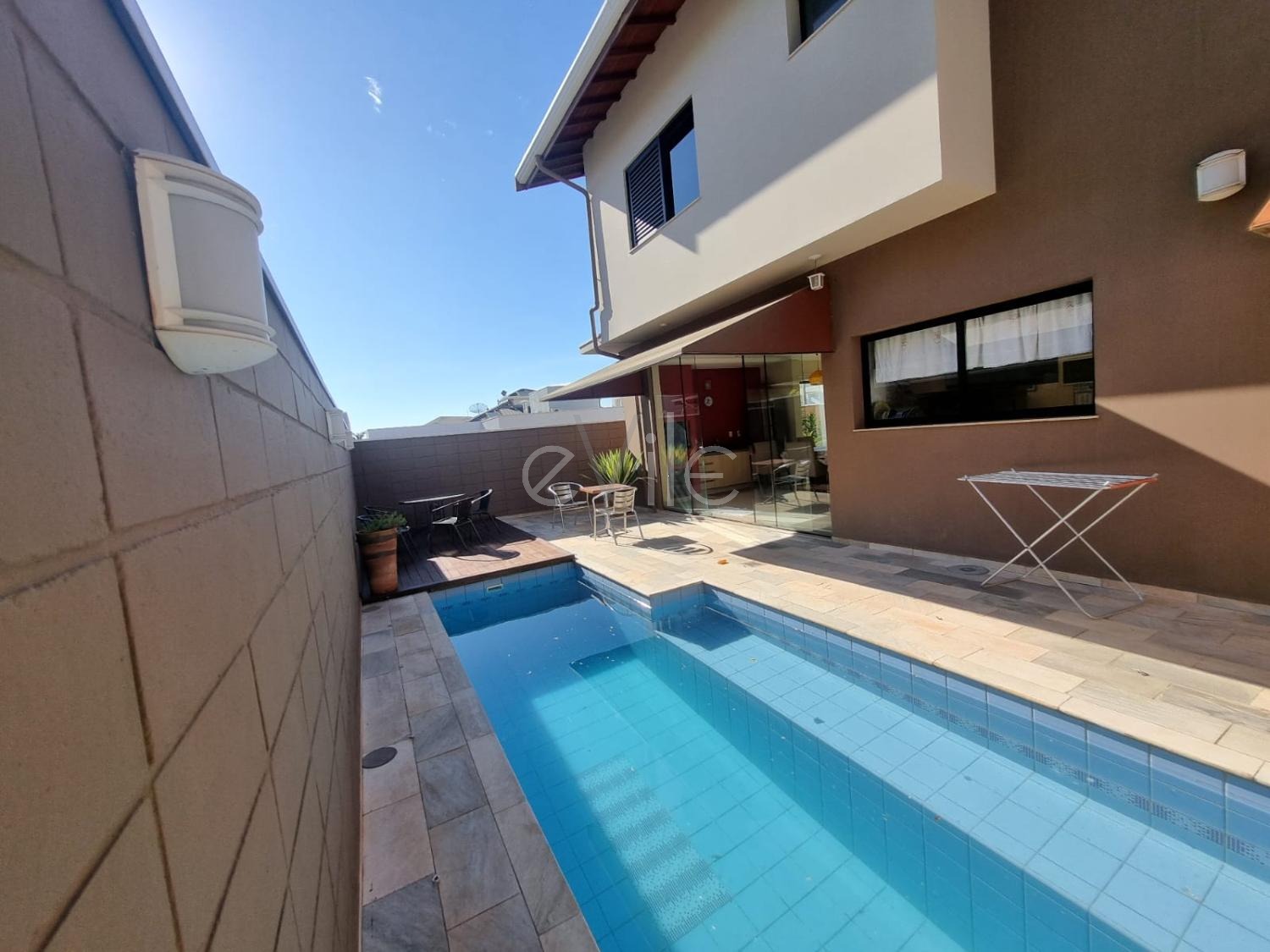 Espaço gourmet com churrasqueira e piscina.