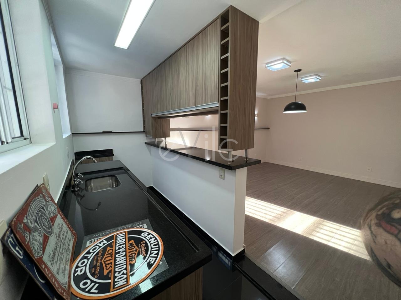 E na parte de baixo tem um apartamento com excelente acabamento, cozinha em estilo americana, 1 suíte com ar condicionado.